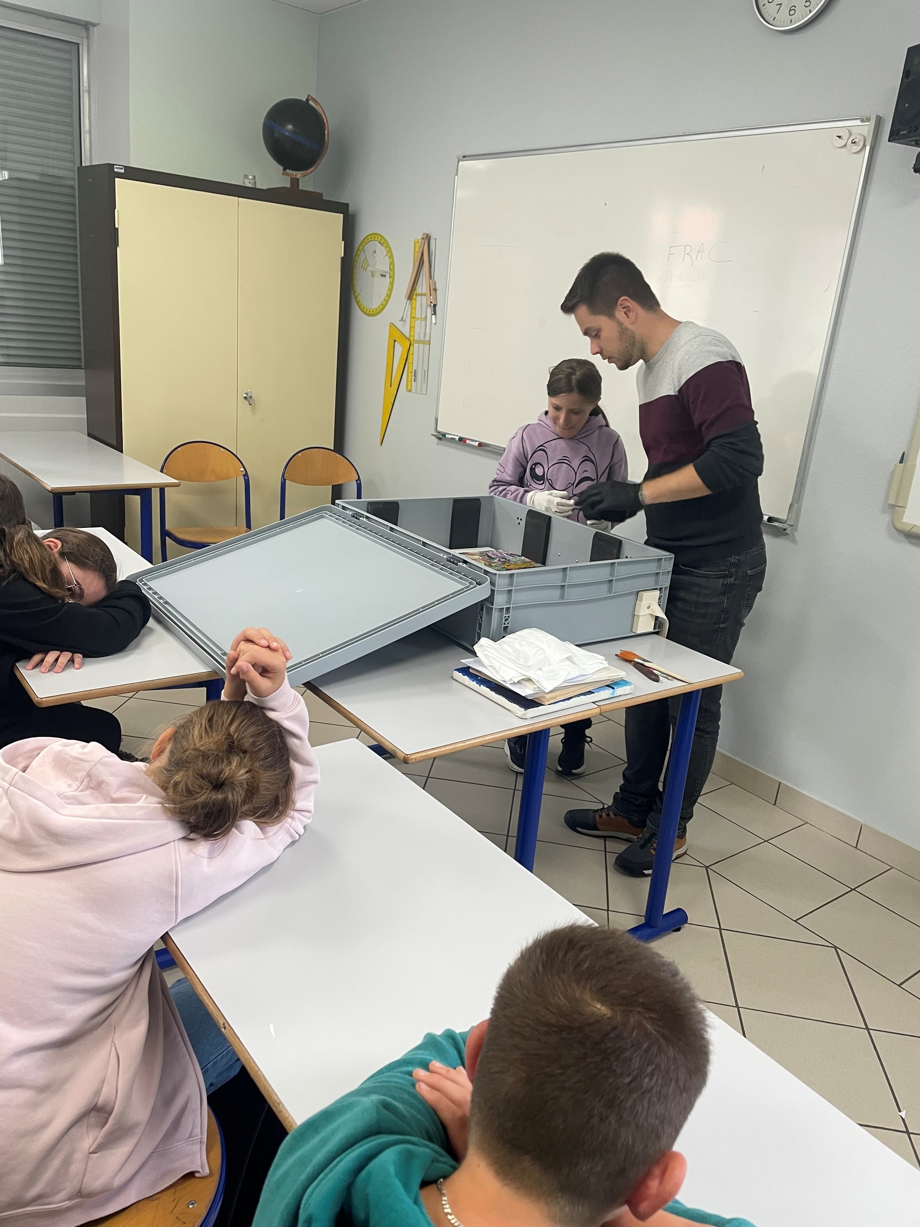 Ce n’est plus le public qui se déplace pour rencontrer des œuvres se sont les œuvres qui viennent au public. La rencontre est riche en sensations bien concrètes. L’œuvre est à portée de main et les élèves ont pu appréhender sa présence physique réelle : taille, texture, matières et couleurs….Guidés par les médiateurs du FRAC, les élèves se sont essayés à l’analyse d’œuvre et ont pu affiner leur regard. Ce fut également l’occasion de découvrir un peu les coulisses d’un musée avec l’évocation des différents métiers qui le composent ; conservateur, guide, restaurateur, médiateur….. et régisseur auquel certains élèves ont prêté main forte ! Merci pour cette belle rencontre.
